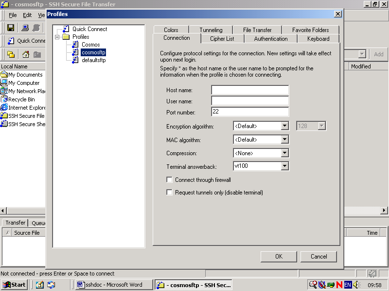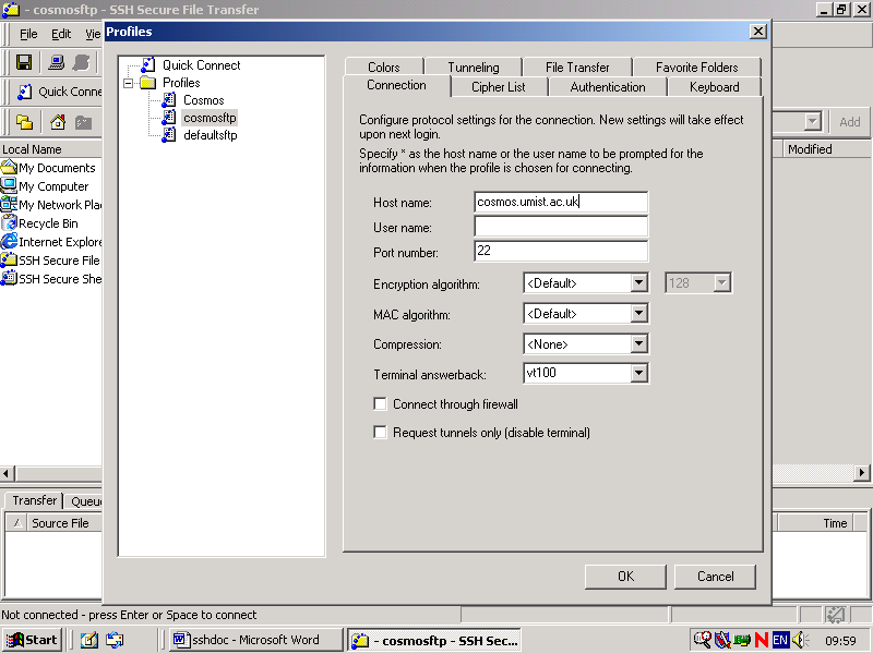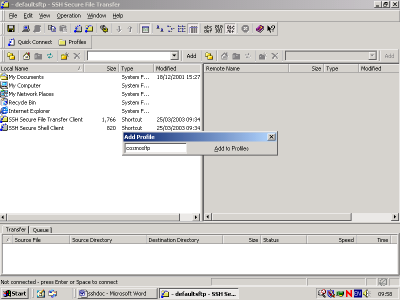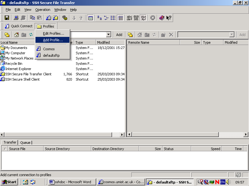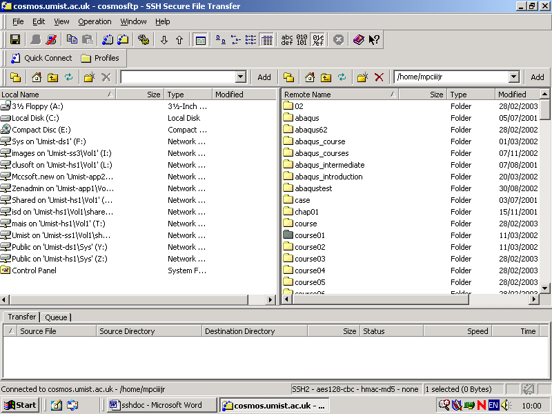 On the left hand pane you can browse your PC, to any local or connected network drives. On the right hand pane you can do likewise with your home directory structure on cosmos. You may transfer files and/or directories between your PC and your cosmos file store or vice-versa by simply highlighting, then dragging and dropping the required directories/files between the two panes (Tip, before commencing with the file transfer, press the F5 key).